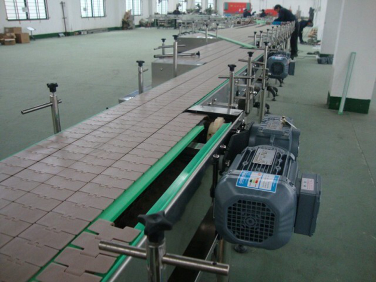 (1)鏈板輸送機的輸送面平坦光滑,摩擦力小,物料在輸送線之間的過渡平穩(wěn),可輸送各類玻璃瓶、PET瓶、易拉罐等物料,也可輸送各類箱包。