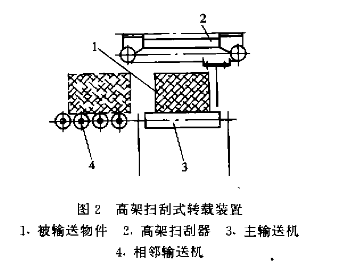 ②高架掃刮式轉載裝置其配置形式如圖2所示,工作方式類似于推桿轉載裝置,只是這種轉載裝置是安裝在滾筒輸送機的上方,通稱為高架掃刮器,利用氣缸或液壓缸在主輸送機3上方橫向往復運動,帶動刮板將物件1從主線輸送機側向移開。它能把被輸送的物件從任意側轉移到鄰近的輸送機4上。這種轉載裝置的安裝僅占用主輸送機上方的一個較小空間,而不占用地面位置。其輸送物件范圍與前述推桿式轉載裝置相同。