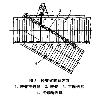這是一種簡單的機械式轉載裝置配置形式如圖3所示,轉臂2可在主輸送機3上方轉動。當處于轉載位置時,可將滾筒輸送機上的物件阻擋,使之改變運行方向進入鄰近的分支輸送機4,也可使轉臂2讓開主輸迭機上的通道,使被輸送物件繼續留在主輸送機上向前運行。為減小轉臂阻擋物件所產生的摩擦阻力,一般在接觸側加裝導向輥子轉臂的操縱可以用手動,更多的是借助于氣缸或液壓缸進行操縱。這種轉載裝置可以保證物件轉到鄰近輸送機后不改變運行方向,這一點對于必須保持物件朝向的場合是非常重要的。這種轉載裝置只適宜于有較好導向側面的物件。