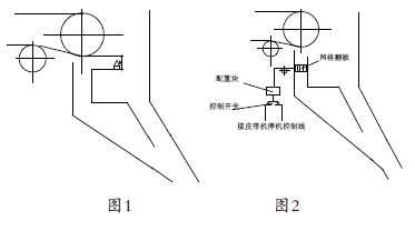 (2)為了使皮帶輸送機(jī)在溜槽堵塞后能及時(shí)停機(jī),在副溜槽內(nèi)加一個(gè)網(wǎng)格狀翻板(做成網(wǎng)格狀是防止粉塵堆積影響效果),翻板與一個(gè)杠桿相連,杠桿的另一端加一組可以調(diào)整重量的配重塊,配重塊的重量略重于翻板的重量(根據(jù)具體情況自行掌握),配重塊端與一個(gè)控制開(kāi)關(guān)相連(開(kāi)關(guān)的類(lèi)型和型號(hào)根據(jù)具體情況選擇),使開(kāi)關(guān)與輸送機(jī)的停機(jī)控制線相連接如圖2所示:
